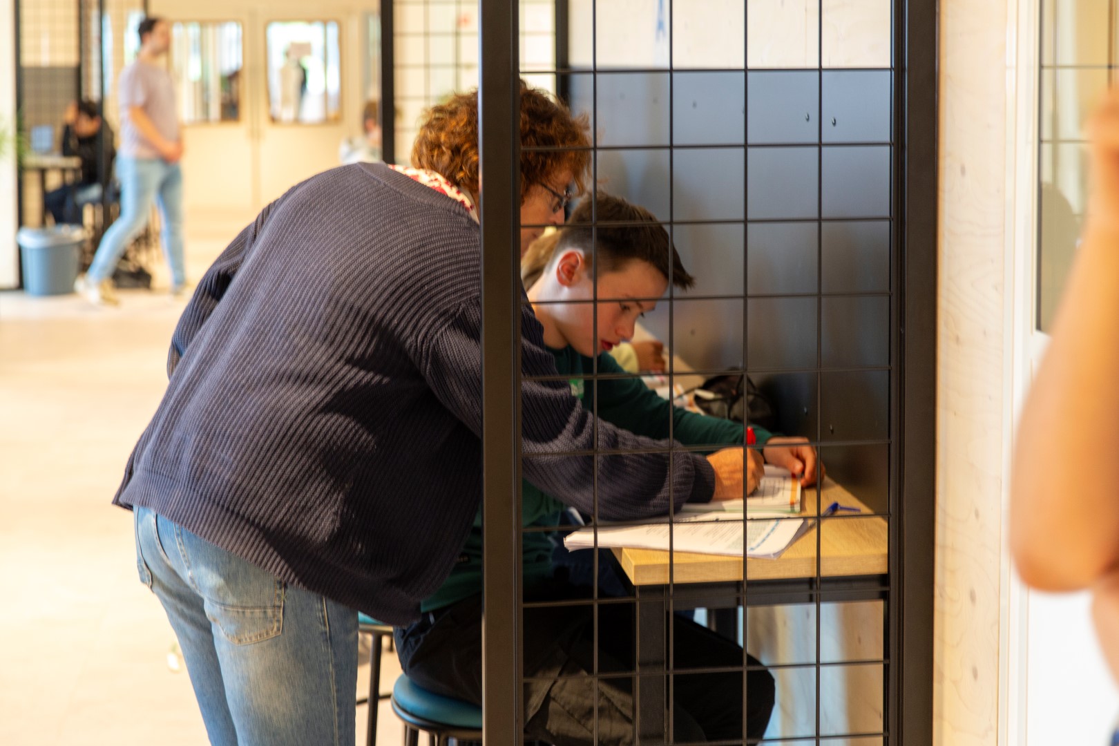 Leerlingen die in groepjes willen overleggen of werken aan een project kunnen gebruik maken van kleinere instructieruimtes. Deze zijn gelegen rondom het grote leerplein.
