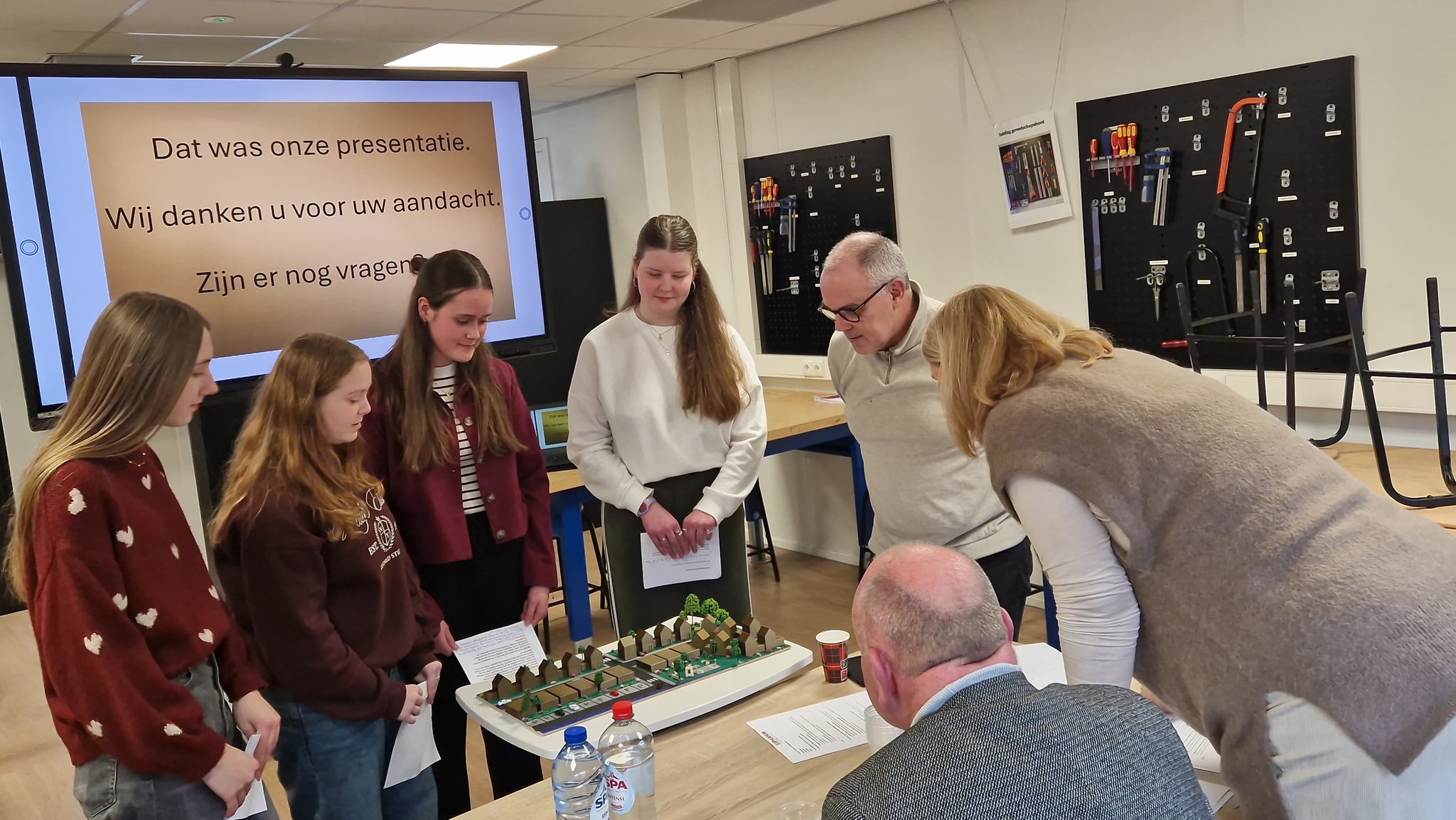 Geïnteresseerd luisterde de burgemeester naar de ontwerpen en ideetjes. Eerder hadden de leerlingen in het Engels of Duits (!) aan hun T&T-docenten gepresenteerd. Een groepje leerlingen koos voor het realiseren van woonhofjes. "Wij kiezen daarvoor zodat we iets kunnen doen tegen de eenzaamheid van oudere mensen. In zo'n hofje kunnen ze met elkaar praten". Een ander groepje heeft een wadi in hun maquette verwerkt. De maquettes zien er werkelijk prachtig uit - met oog voor details. "We waren het hekje voor de beek vergeten, we hadden iets te weinig tijd", verontschuldigde een leerling zich. "Geeft niks", aldus Van den Boorn, "wij denken dat hekje er wel bij".