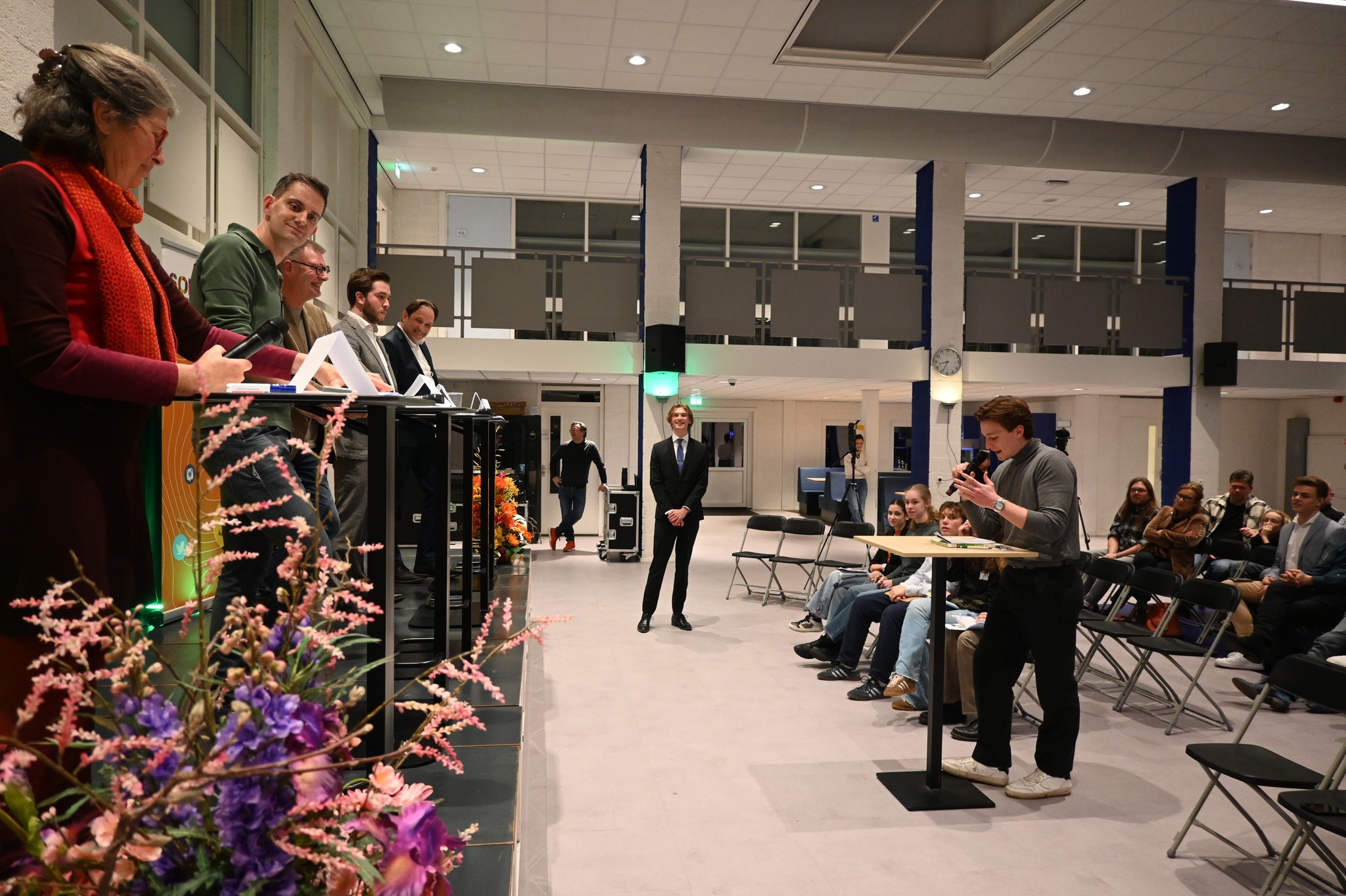 Drie debatrondes volgden, over onderwerpen die door de leerlingen gekozen waren: jongerenparticipatie, woningbouw en landbouw. De rondes werden geleid door Vince (6VWO), Gilles (6VWO) en Femke (5VWO). Zij deden dit met verve! Onze leerlingen hadden zich goed voorbereid. Ze hadden zich ingelezen in de programma's van de partijen, de standpunten van de zittende raadsleden doorgeplozen en vragen voorbereid. De politici probeerden zo goed mogelijk antwoorden te geven op deze vragen, maar de leerlingen lieten zich niet altijd snel overtuigen en vroegen dóór. Het kan haast niet anders of de politici moeten stiekem toch wel genoten hebben van deze oprechte interesse en betrokkenheid van onze leerlingen - de jeugd en de toekomst van het Heuvelland.