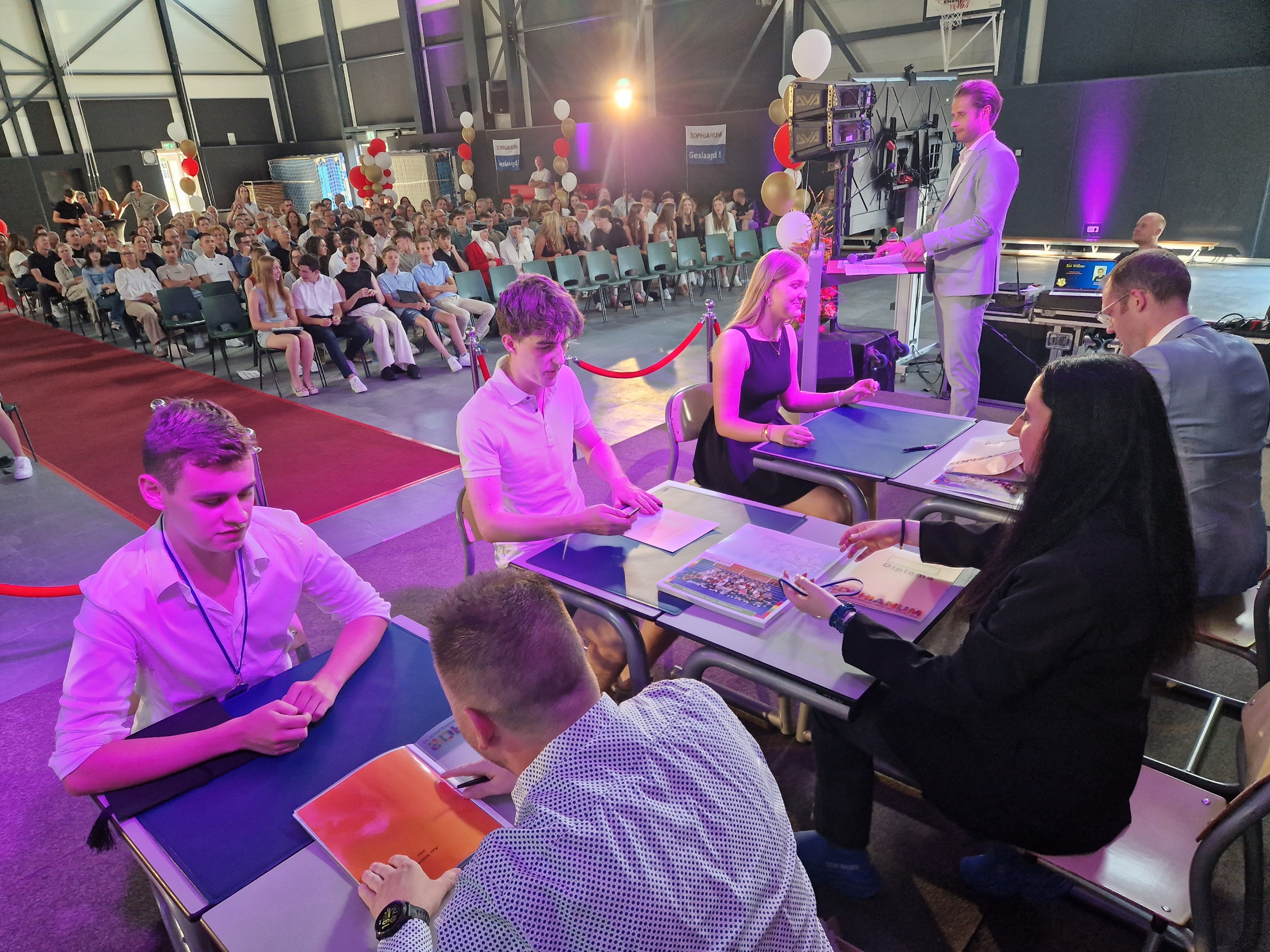 Dhr. Hupperetz krijgt óók zijn diploma. Hij mag, net zoals de leerlingen, op het podium het diploma tekenen. Leerlingen genieten van deze laatste bijeenkomst. Ze kunnen niet wachten om de wijde wereld te gaan verkennen. Wij wensen deze leerlingen en al die andere geslaagde examenleerlingen, een mooie verkenning toe. Succes op jullie vervolgopleiding, geniet van alle mooie momenten, blijf jezelf en denk soms nog eens aan dat schooltje onder aan de Gulperberg. Dan denken wij ook nog eens aan jou.