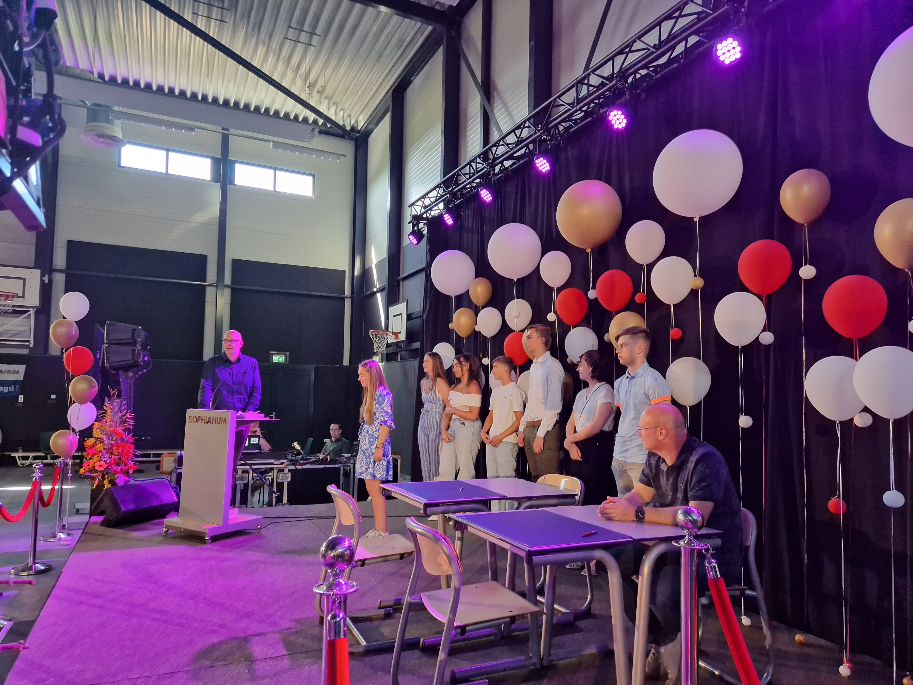 Na afloop proosten de leerlingen nog een keer met hun docenten en klasgenoten op hun behaalde resultaat. Daarna gaan ze de deur uit, de wijde wereld in, hun toekomst tegemoet. Ze kijken naar het logo van het Sophianum, aan de buitenkant van het gebouw. "V'r zunt d'r vanaaf!"