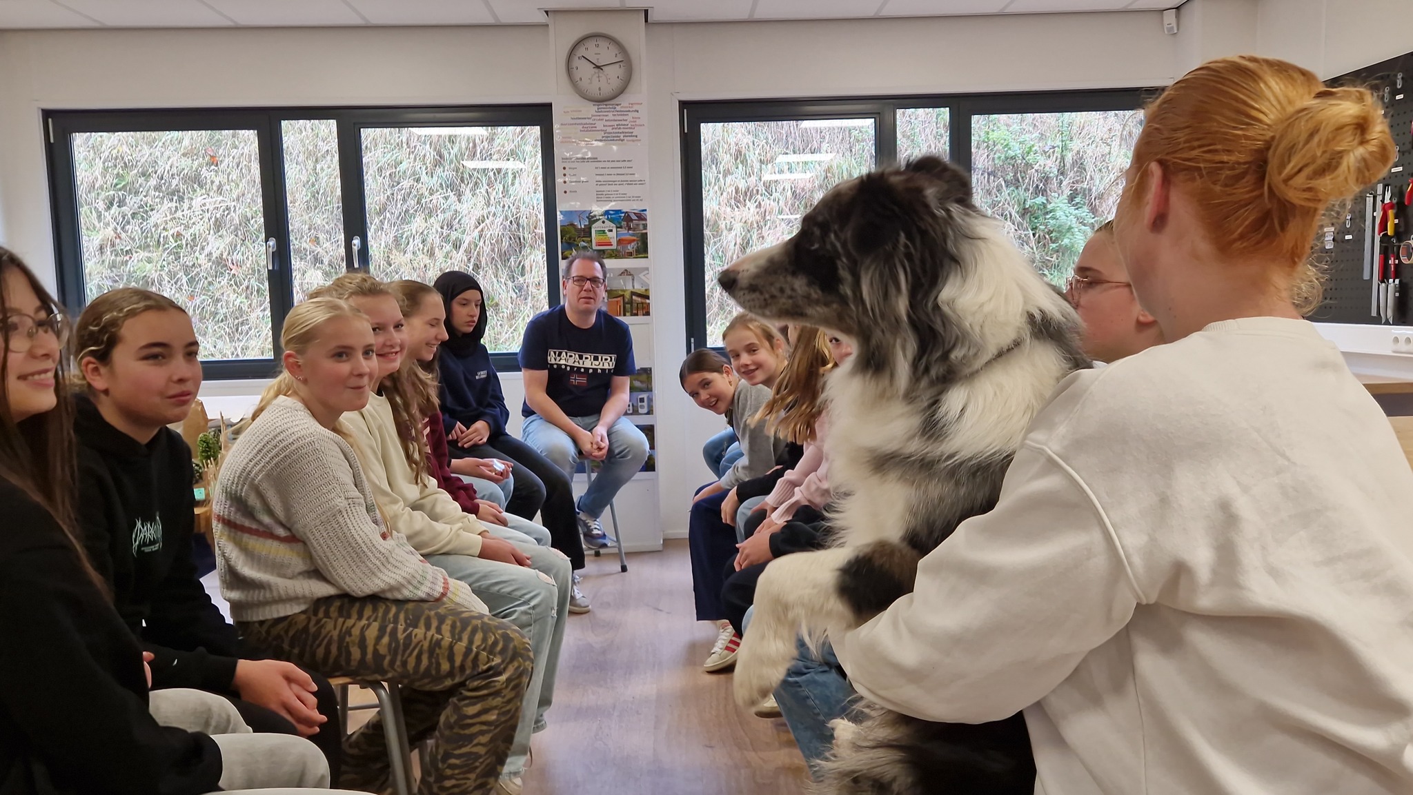 "Kan hij ook kunstjes?" De MAVO-brugklassers willen het tóch even weten. "Ja hoor", zegt Tom Quaedvlieg van het Yuverta College. En daar ligt Boaz de hond op de rug met zijn poten in de lucht. Hij speelt 'dood'.