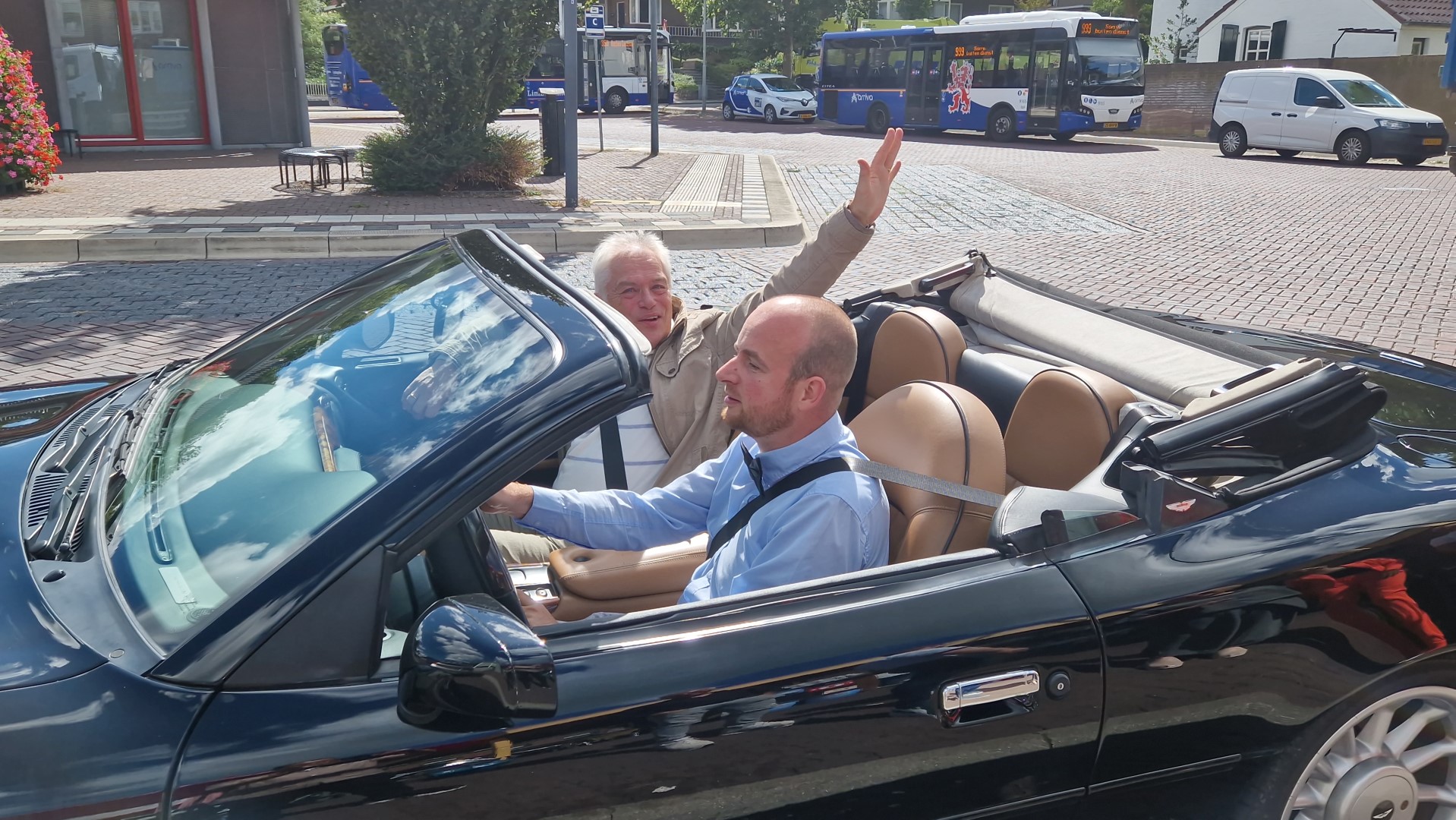 Tijd voor de lunch. Met de Aston Martin ging het duo Hupperetz en Brekelmans naar.... friture An & Piet. Klein geheimpje: meneer Hupperetz is niet zo goed op de hoogte van frituresnacks. Daarom. Angelique zorgde met haar bekende enthousiasme en vrolijkheid voor een gezellige lunch, terwijl het halve busstation zich afvroeg van wie die sjieke auto was.. Na de lunch werd dhr. Hupperetz - met open dak - naar huis gereden om zich voor te bereiden op het tweede, officiëlere gedeelte van de dag..