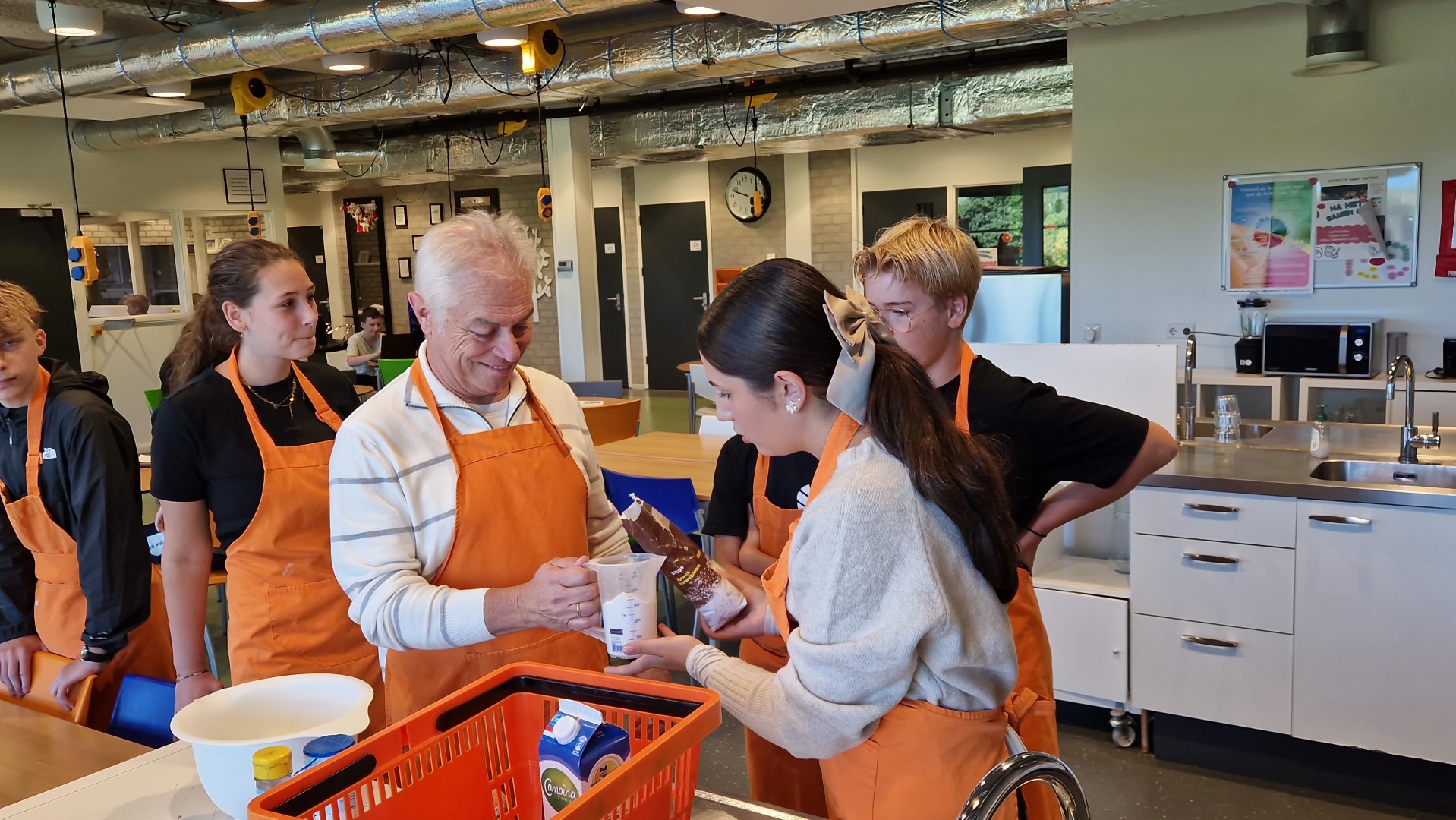 Dhr. Hupperetz kreeg een rugzakje met schoolspullen, want hij ging als gastleerling zijn laatste schooldag beleven. En - zo zijn we dan ook weer - dat gebeurde bij de praktijkvakken. Bij D&P maakte hij, onder leiding van drie leerlingen van 3VMBO, een stapel pannenkoeken. De leerlingen deden het fantastisch. ("Hans, wel even opletten. Je hebt er te weinig melk bij gedaan. KIjk nu wat er gebeurt!") Bij O&O leerde hij een sleutelhanger (met een muziekje) te graveren - ook hier weer met hulp van leerlingen. Bij T&T liet hij zich bijpraten over het project van de brugklassers. Bij CKV ging hij, onder leiding van mevrouw Pricken aan de slag met klei. Hoewel het eerst op een asbakje leek, werd het uiteindelijk een leuk tapasbakje.