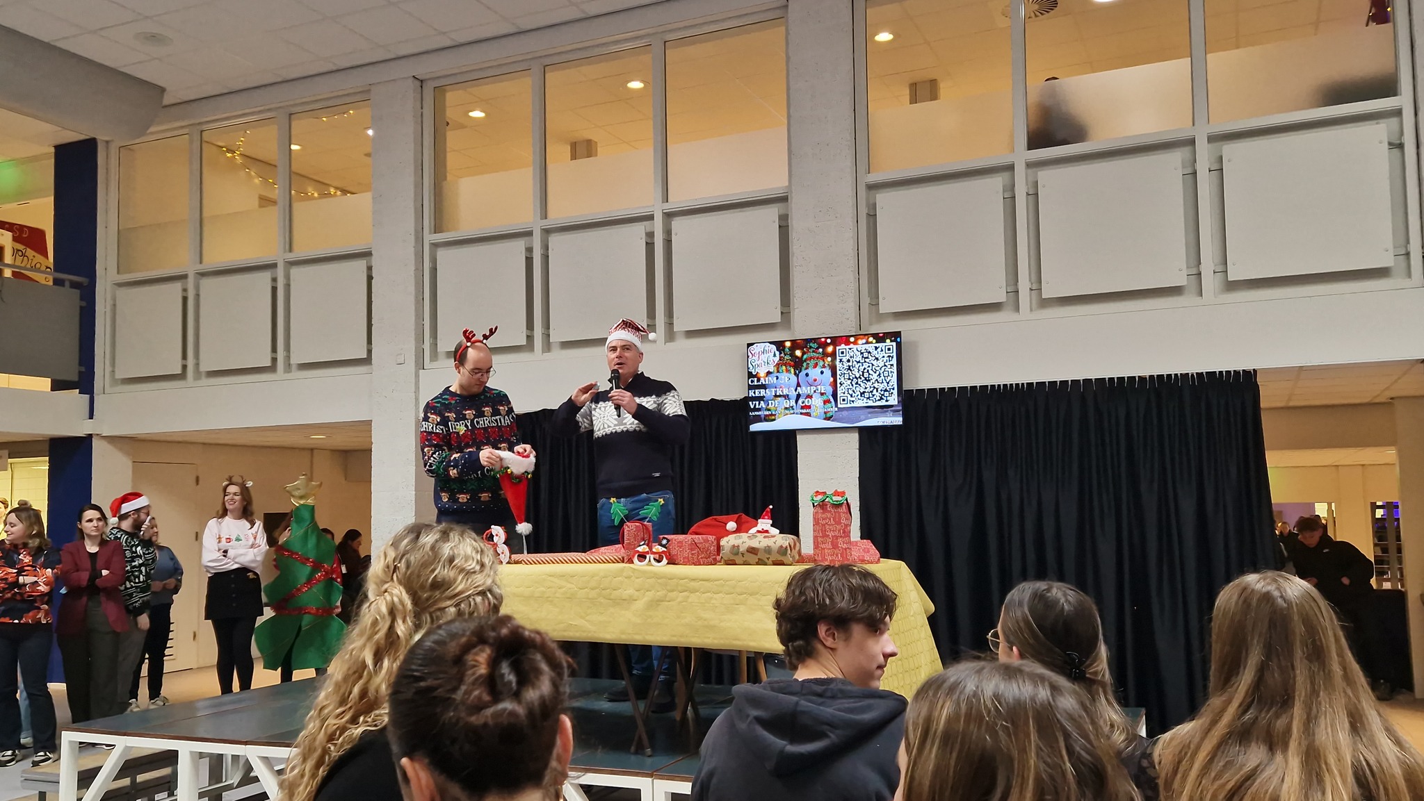 Het regende cadeautjes, vrijdag 19 december jl., aan het einde van de kerstactiviteitendag. Dhr. Weijmans, onze rector, verzorgde de trekking van de tombola in de aula. En als we dan toch richting Kerstmis gaan, horen daar ook cadeautjes bij. Het was de afsluiting van een ochtend met diverse workshops in en rond het gebouw.