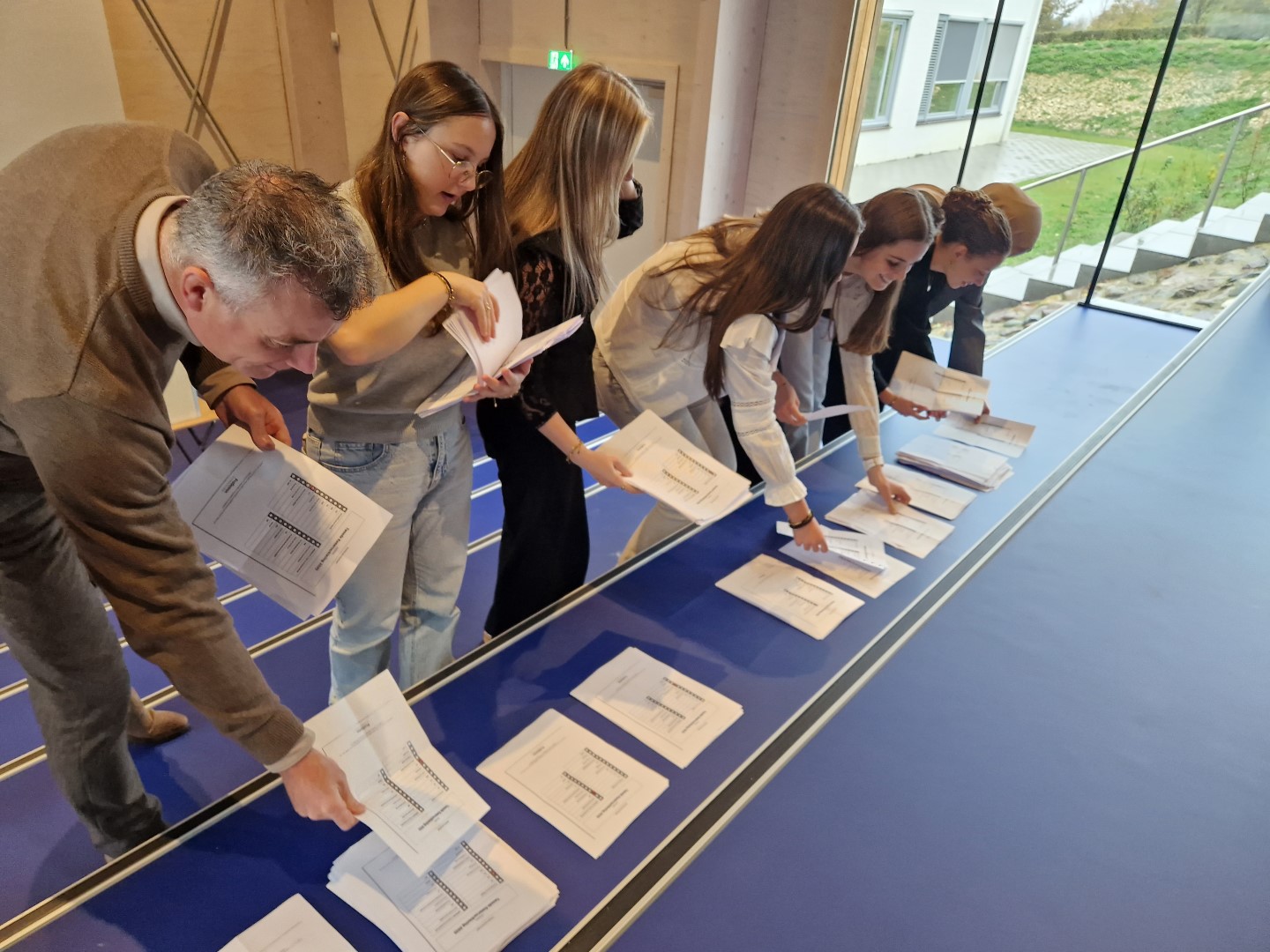 In het koppelstuk had de leerlingorganisatie een stemlokaal nagebootst. Daar konden de leerlingen hun stem uitbrengen. Onze rector, dhr. Weijmans, was aanwezig om zich door de leerlingen te laten bijpraten over deze verkiezingen. Daarnaast hielp hij mee met het tellen van de stemmen. "Deze verkiezingen zijn een middel om het gesprek in de klas op gang te brengen", zo vertelde de rector, terwijl hij tussen de leerlingen de stembiljetten op de juiste stapels legt. "Zeker in een periode met polarisatie is dat heel belangrijk".
