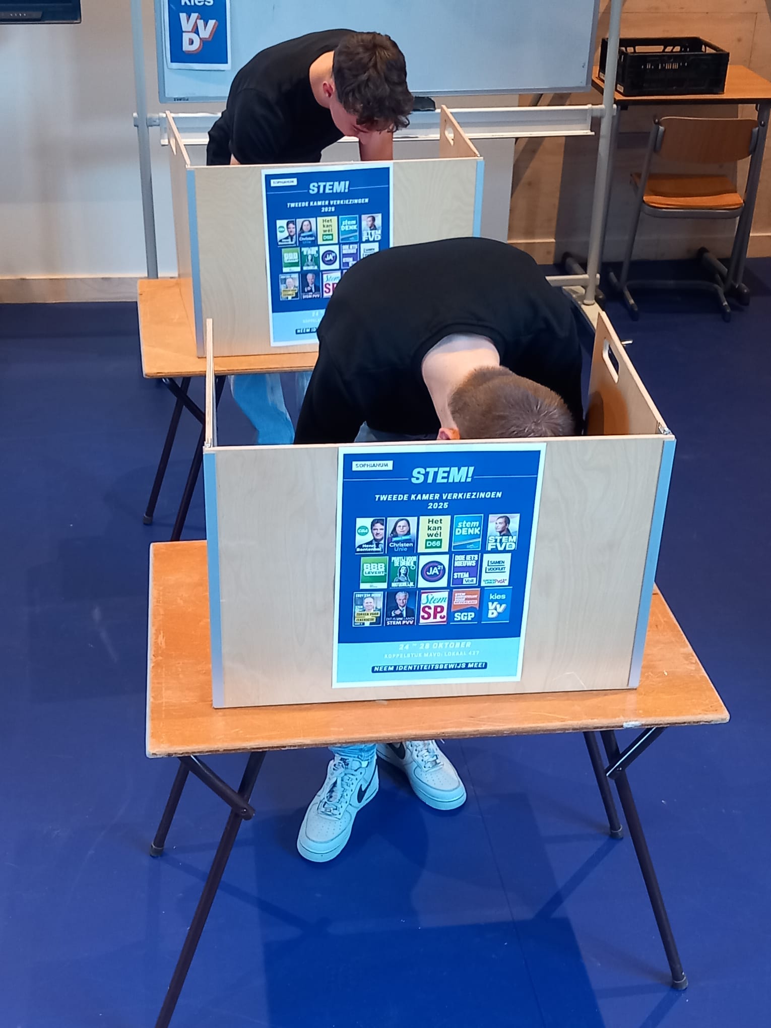 In het koppelstuk had de leerlingorganisatie een stemlokaal nagebootst. Daar konden de leerlingen hun stem uitbrengen. Onze rector, dhr. Weijmans, was aanwezig om zich door de leerlingen te laten bijpraten over deze verkiezingen. Daarnaast hielp hij mee met het tellen van de stemmen. "Deze verkiezingen zijn een middel om het gesprek in de klas op gang te brengen", zo vertelde de rector, terwijl hij tussen de leerlingen de stembiljetten op de juiste stapels legt. "Zeker in een periode met polarisatie is dat heel belangrijk".
